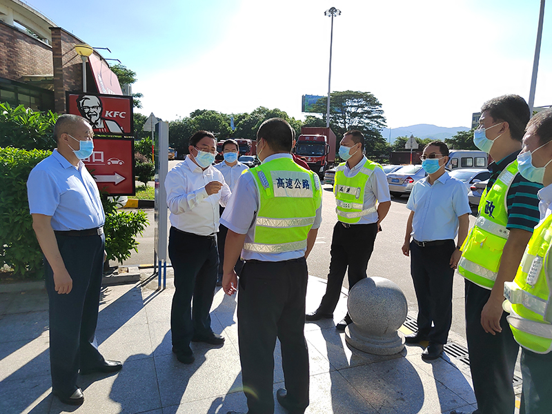 2022年7月11日,時(shí)任省交通運(yùn)輸廳黨組書記、副廳長(zhǎng),現(xiàn)任省交通運(yùn)輸廳黨組書記、廳長(zhǎng)林飛鳴一行到大嶺山服務(wù)區(qū)檢查防疫工作
