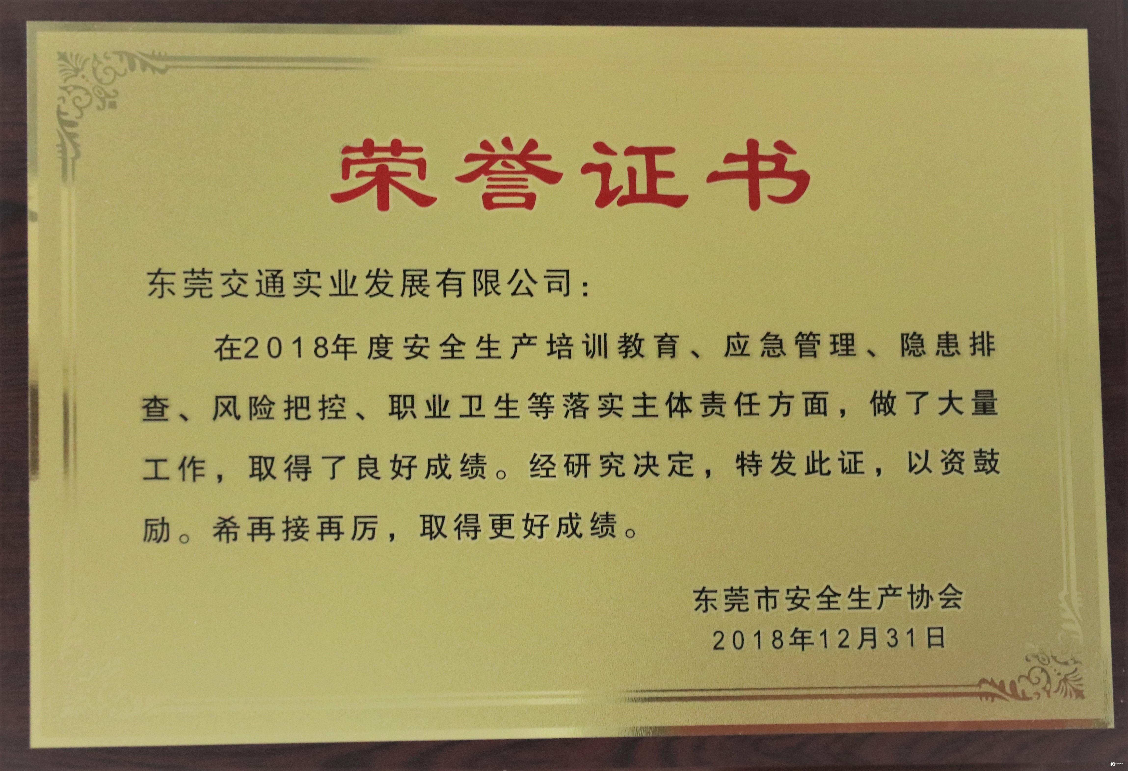 2018年12月,交通實業(yè)公司獲東莞市安全生產(chǎn)協(xié)會頒發(fā)2018年企業(yè)安全生產(chǎn)工作突出成績獎。