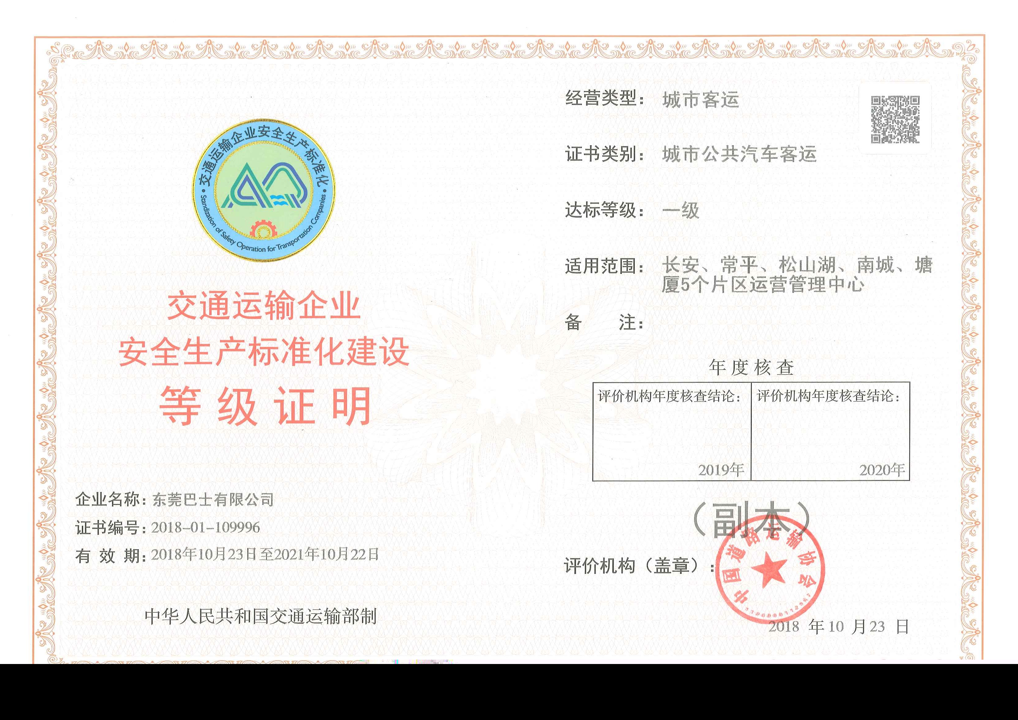 2018年10月,東莞巴士公司被中國道路運(yùn)輸協(xié)會評為城市公共汽車客運(yùn)安全標(biāo)準(zhǔn)化一級達(dá)標(biāo)企業(yè)。