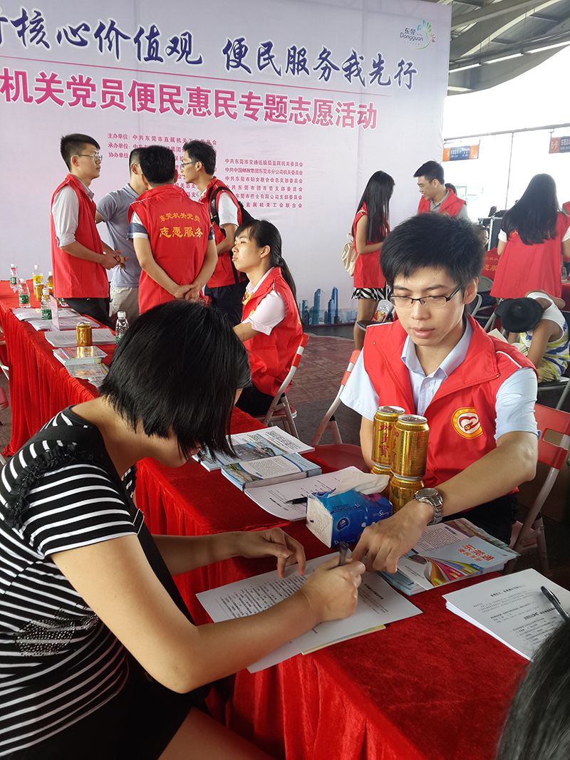 2015年8月29日,東莞通黨員、團(tuán)員在萬江汽車總站,參加市直工委舉辦的“踐行核心價(jià)值觀,便民服務(wù)我先行”黨員志愿服務(wù)活動(dòng)。