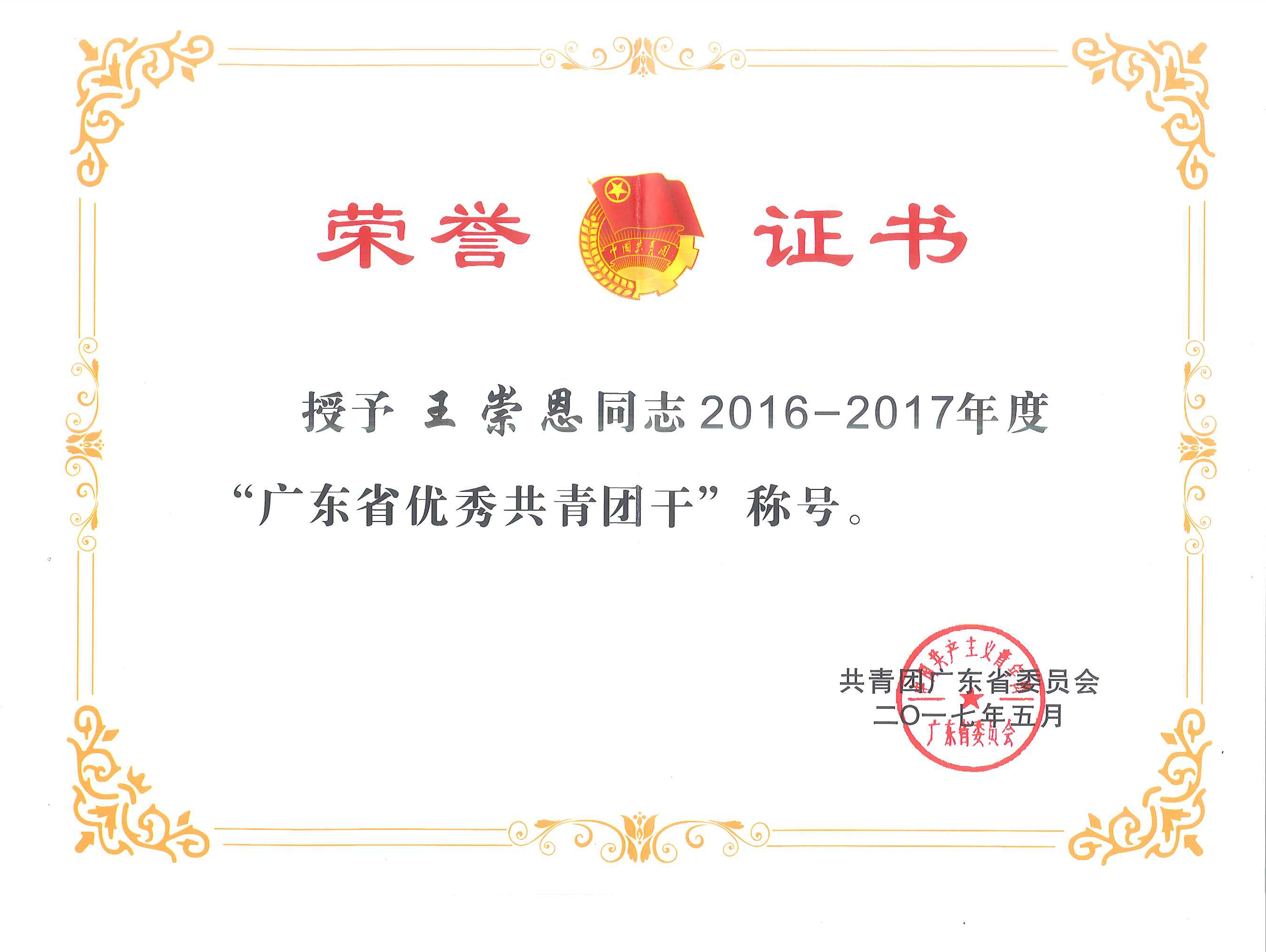 2017年5月,團(tuán)省委向東莞巴士公司王崇恩授予2016-2017年度“廣東省優(yōu)秀共青團(tuán)干”稱號。