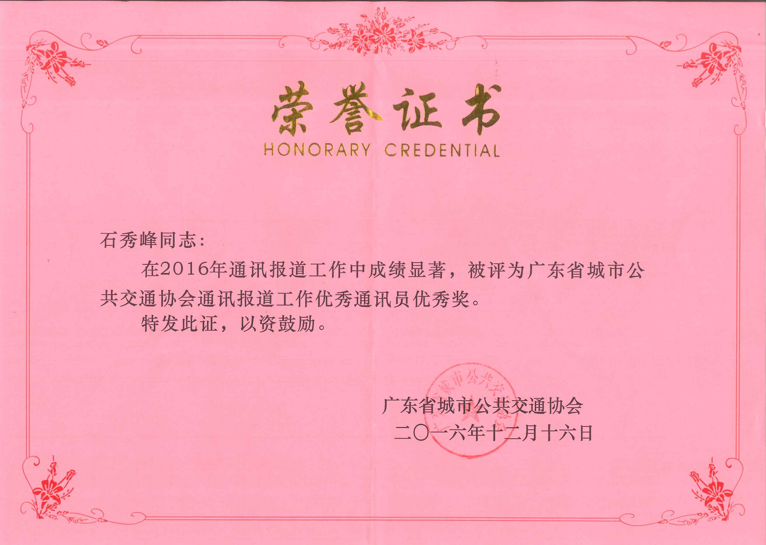 2016年12月,東莞巴士公司石秀峰被評為廣東省城市公共交通協(xié)會通訊報(bào)道工作優(yōu)秀通訊員優(yōu)秀獎(jiǎng)。