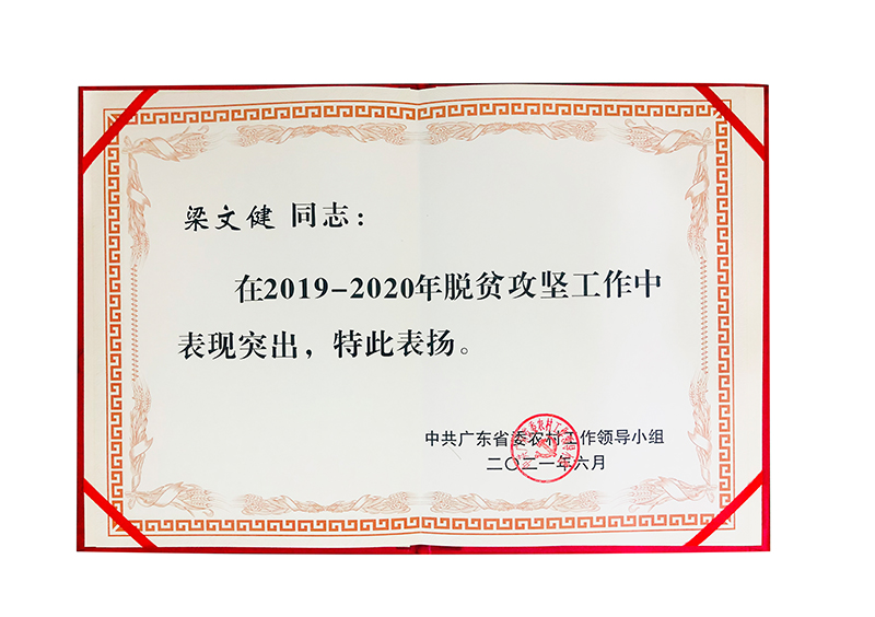 2021年6月,我司梁文健同志榮獲2019-2020年全省脫貧攻堅(jiān)工作突出貢獻(xiàn)個(gè)人