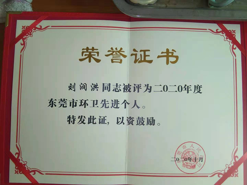 2020年10月1日,二O二O年度東莞市環(huán)衛(wèi)先進(jìn)個(gè)人(劉潤洪)