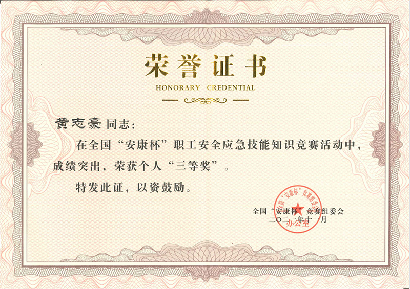 交通實(shí)業(yè)公司黃志豪榮獲2021年度全國“安康杯”競賽職工安全應(yīng)急技能知識競賽活動(dòng)三等獎(jiǎng)