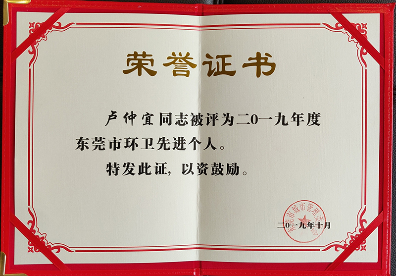 2019年10月,盧仲宜獲2019年度東莞市環(huán)衛(wèi)先進(jìn)個(gè)人