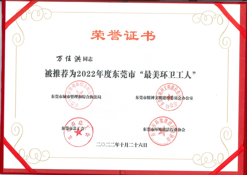 2022年10月,經(jīng)緯公司萬任洪同志榮獲2022年度東莞市“最美環(huán)衛(wèi)工人”稱號