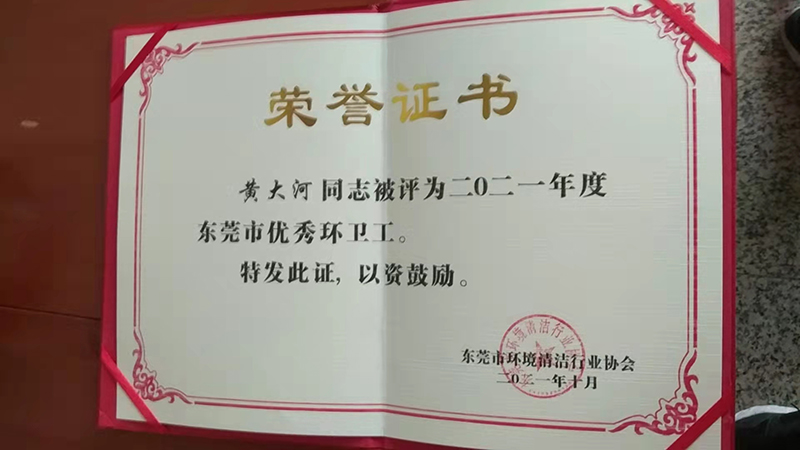 2021年10月1日,東莞控股公司黃大河獲得“二O二一年度東莞市優(yōu)秀環(huán)衛(wèi)工”稱號