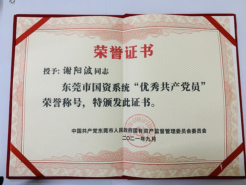 2021年9月1日,東莞控股公司謝陽波獲得東莞市國資系統(tǒng)“優(yōu)秀共產(chǎn)黨員”榮譽(yù)稱號