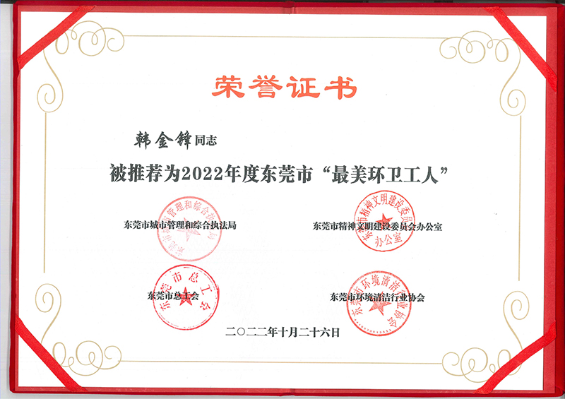 2022年10月,經(jīng)緯公司韓金鋒同志榮獲2022年度東莞市“最美環(huán)衛(wèi)工人”稱號