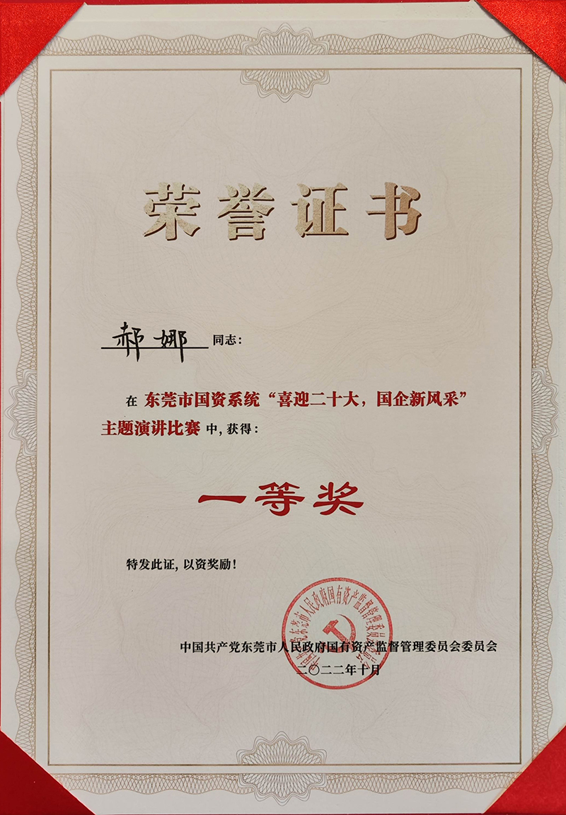 2022年10月,東莞控股公司郝娜獲得東莞市國資系統(tǒng)“喜迎二十大,國企新風(fēng)采”主題演講比賽一等獎(jiǎng)