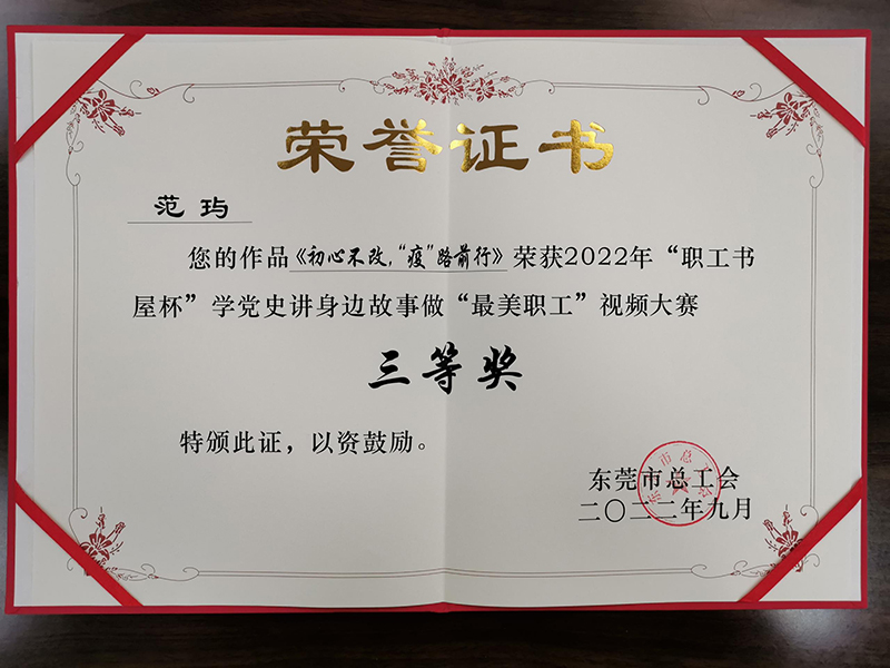 2022年9月,市路橋公司范玙榮獲東莞市總工會2022年“職工書屋杯”學(xué)黨史講身邊故事做“最美職工”視頻大賽三等獎(jiǎng)
