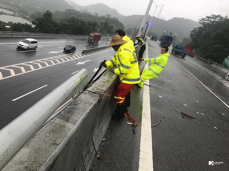 ?;⒎止九c經(jīng)緯公司在“山竹”臺風(fēng)后全力搶修路面受損設(shè)施