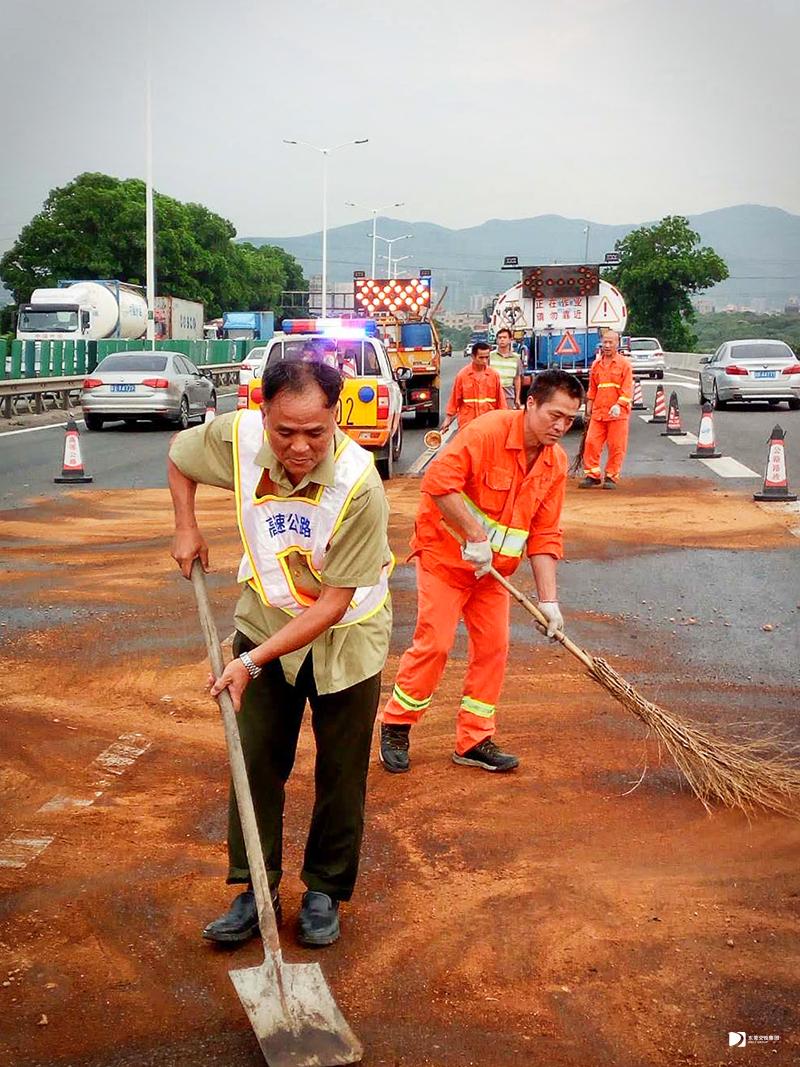 常虎分公司養(yǎng)護人員清理油車漏油現(xiàn)場