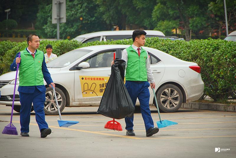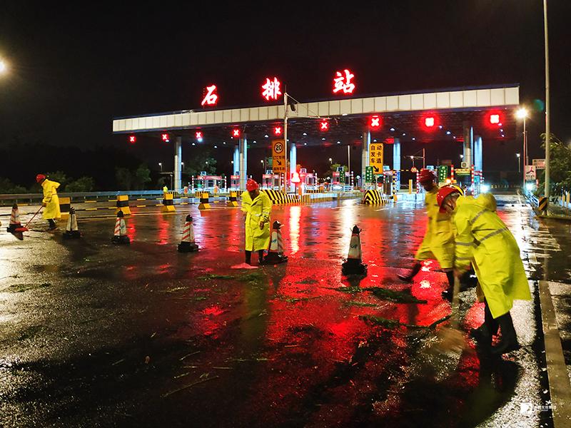 臺風(fēng)山竹吹襲期間,?;⒎止臼召M人員清掃收費廣場