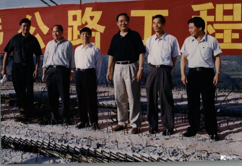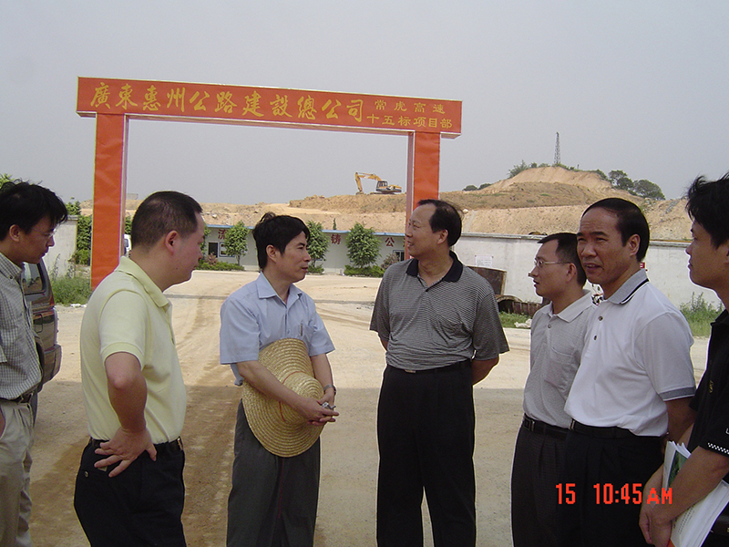 2004年6月15日,時任省交通廳陳冠雄副廳長(左三)在路橋總公司總經(jīng)理鐘旭堆(右四)的陪同下視察?;⒏咚俟方ㄔO(shè)情況。