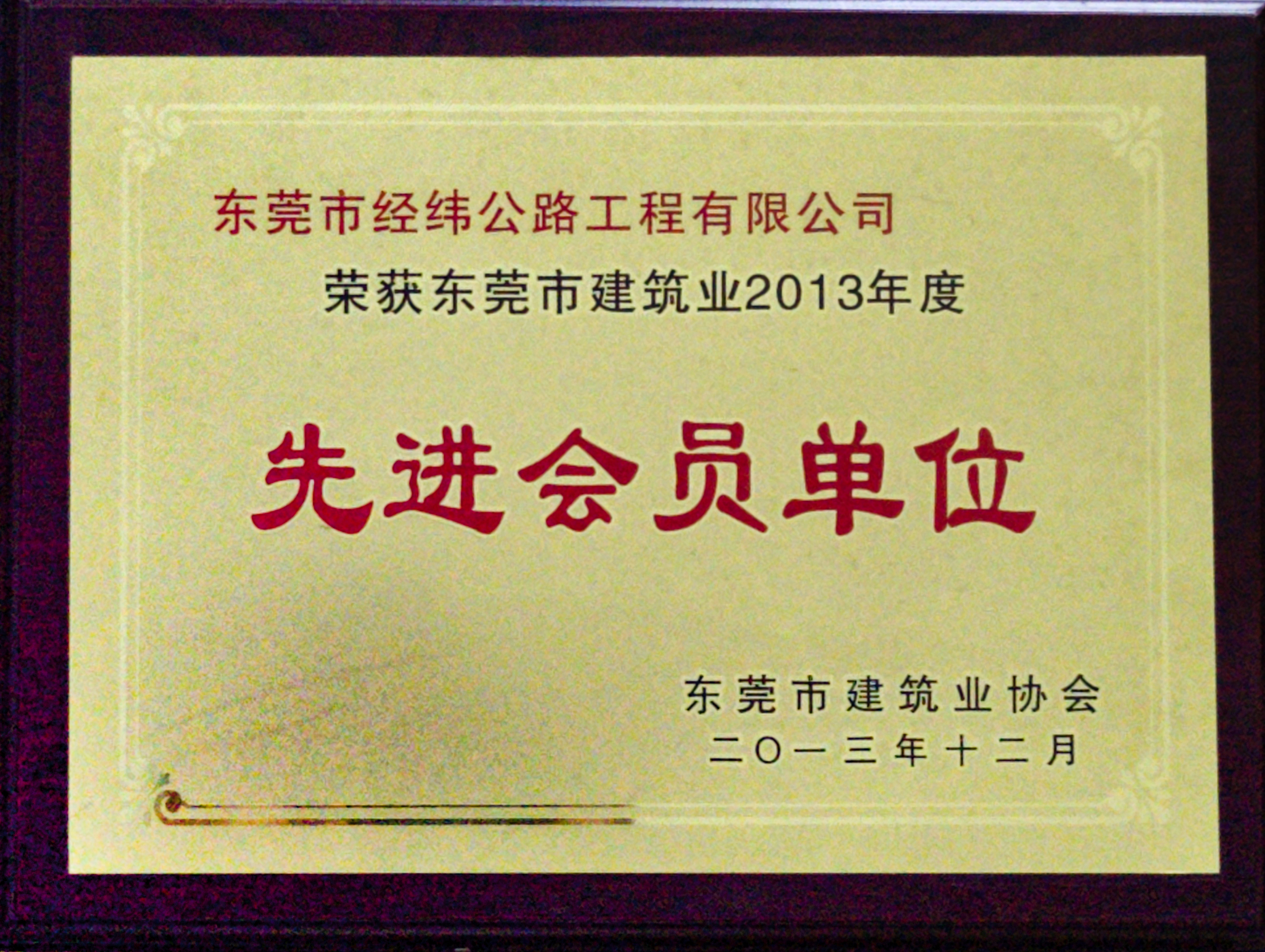 2013年12月,經(jīng)緯公司獲東莞市建筑業(yè)協(xié)會評為東莞市建筑業(yè)2013年度“先進會員單位”榮譽稱號。