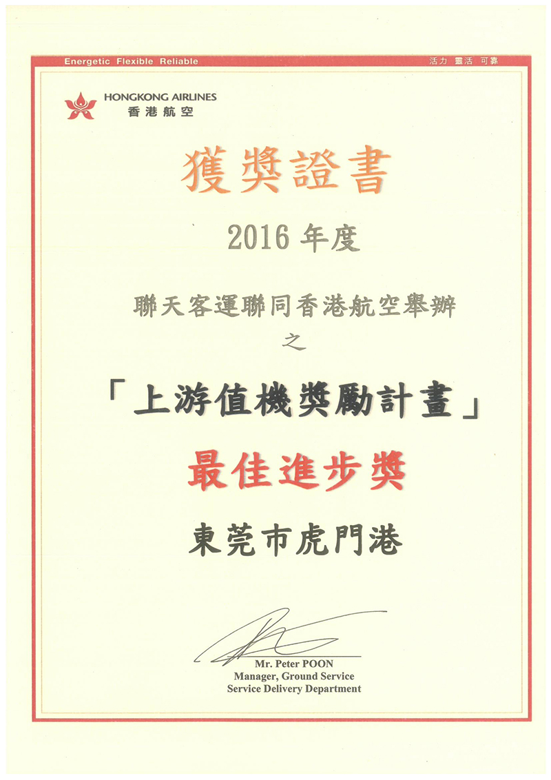 東莞市虎門港榮獲香港航空2016年度“上游值機獎勵計劃”最佳進步獎