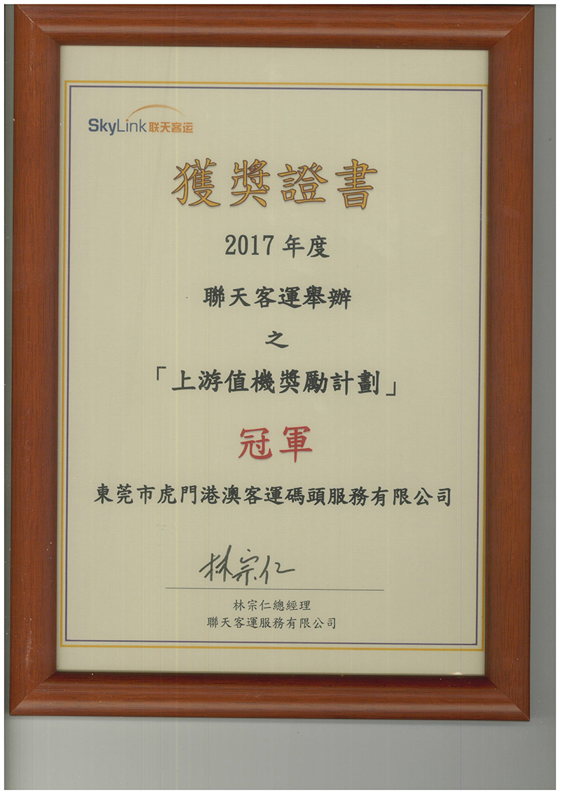 2017年虎門港澳客運公司榮獲“上游值機獎勵計劃”冠軍