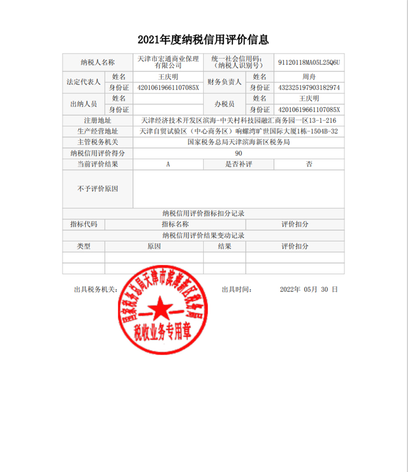 2022年5月30日,宏通保理公司獲得“2021年度納稅信用A級評價”
